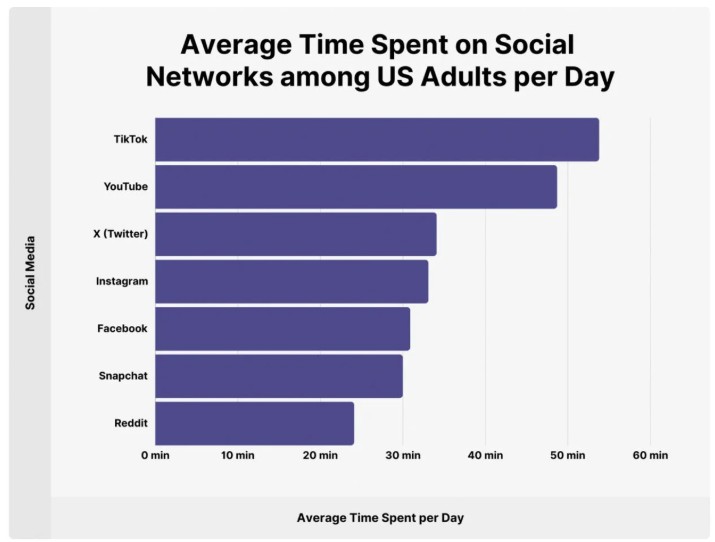 Uit onderzoek van Backlinko blijkt dat TikTok in de VS de meeste gebruikte app per dag is, met 53 minuten per dag.